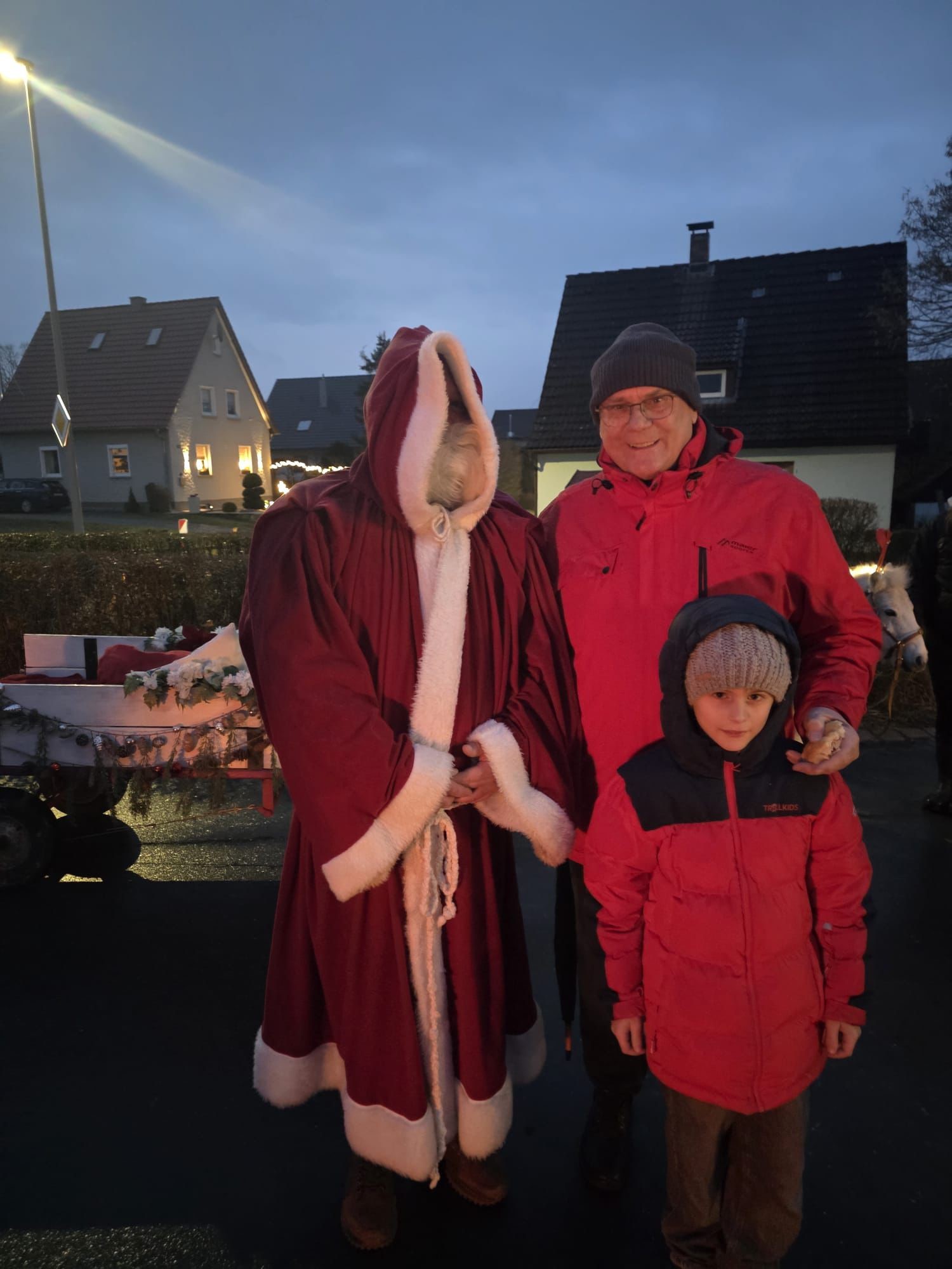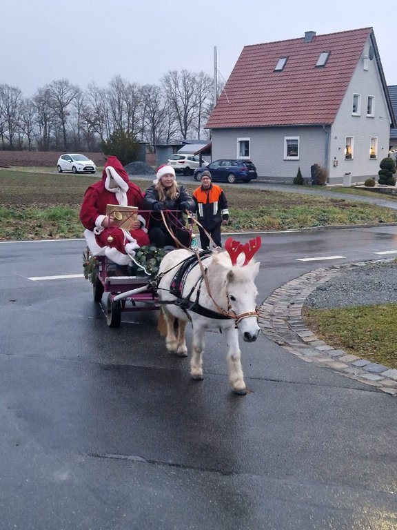 Als der Nikolaus schließlich eintraf, kam er nicht unbemerkt. Das Pony Niesi, ein 13 Jahre altes Gnadenpony, zog den Wagen ruhig durch den Ort. In der Mähne trug es eine Lichterkette, auf dem Kopf ein Elchgeweih. Die Beleuchtung war für die Fahrt auf der Ortsstraße notwendig – wurde von den Kindern aber vor allem mit Staunen wahrgenommen.