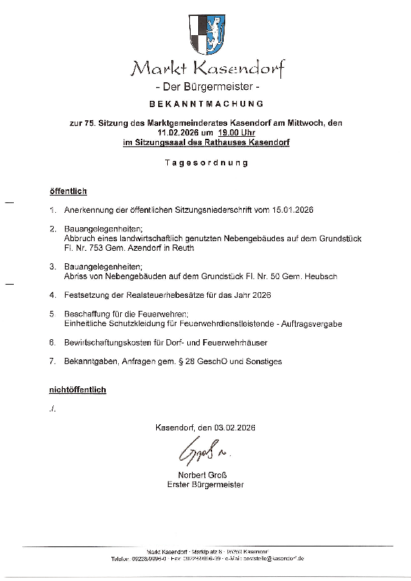 Die 75. Sitzung des Marktgemeinderates Kasendorf findet am 11.Februar um 19 Uhr im Sitzungssaal des Rathauses statt.